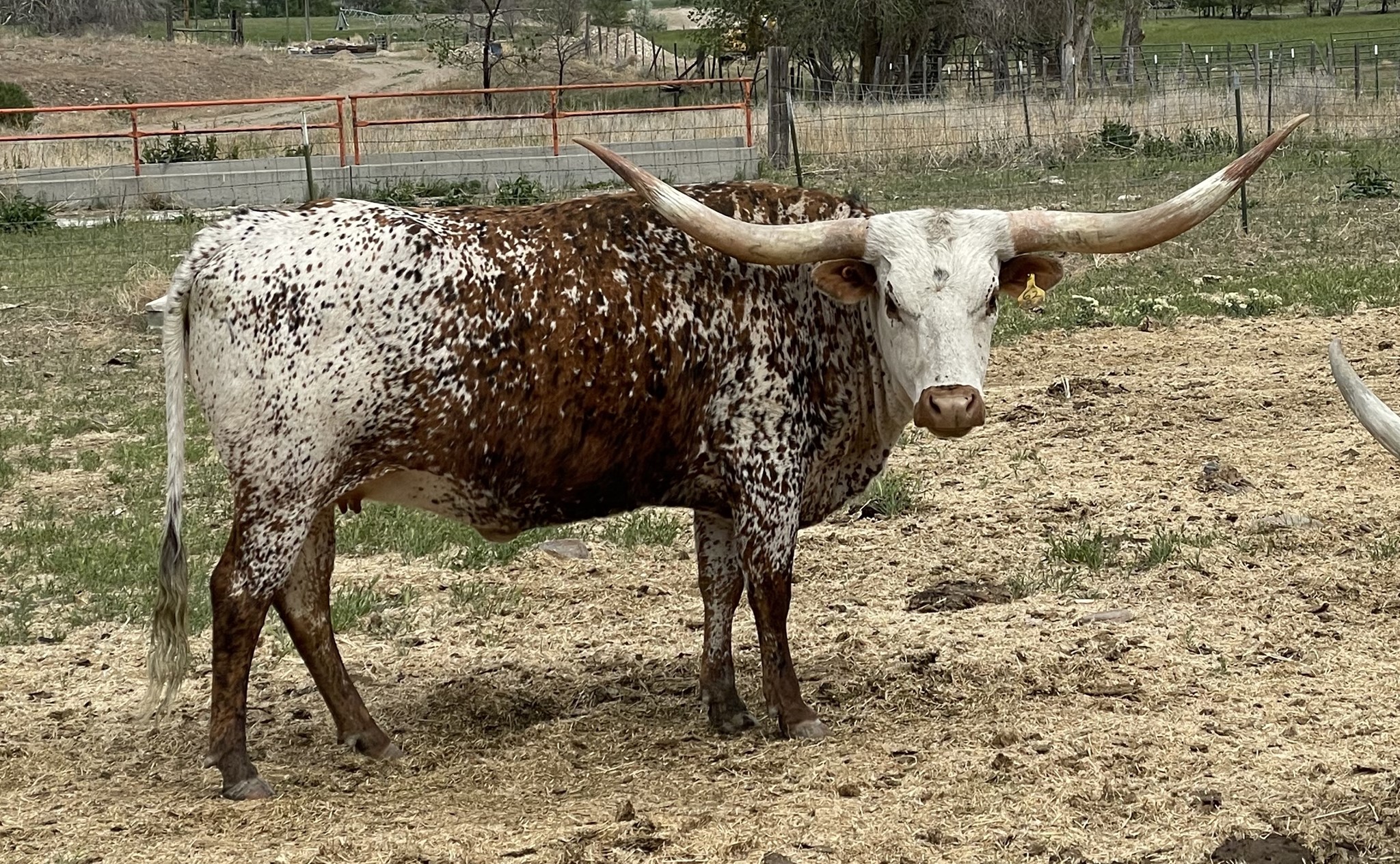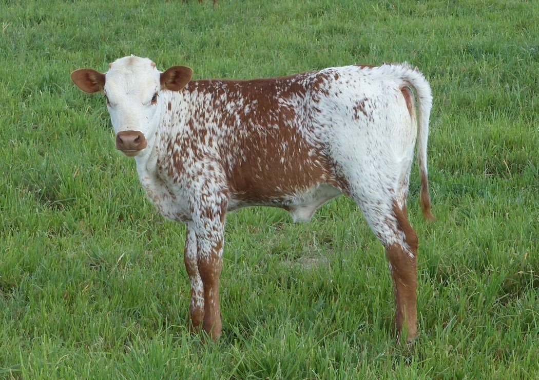 Gorgeous brindle speckled young cow. She has a gorgeous bull calf at side by Gold Mine 1. She is one to look at for gorgeous calves! She produces them every time +
